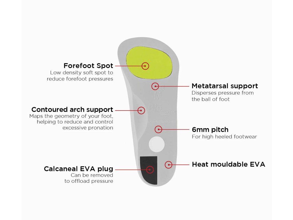 Klíčovou vlastností je tenké sulcus prodloužení s měkkým místem nízké hustoty a mírnou metatarzální podporou , které účinně snižuje tlak v předonoží - časté místo diskomfortu při nošení bot na podpatku. Slim design umožňuje bezproblémové vložení do nízkobjemové módní obuvi bez kompromisů ve stylu.