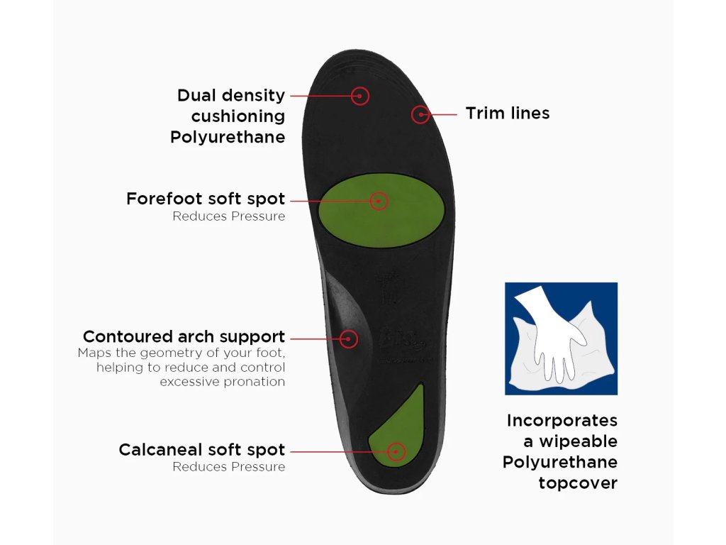 LBG Medical Bio Soft černá je prémiová ortopedická stélka, vyvinutá speciálně pro osoby s rizikovými chodidly, jako jsou diabetici nebo pacienti s revmatoidní artritidou. Díky anatomickému tvarování a hlubokému patnímu lůžku poskytuje vynikající oporu klenby, koriguje nadměrnou pronaci a zlepšuje celkové postavení chodidla. Dvouvrstvá polyuretanová konstrukce zajišťuje maximální tlumení nárazů i při vysokém zatížení, například při sportu. Dvě měkké zóny ve strategických místech pomáhají odlehčit tlak v oblasti paty a přední části nohy. Otíratelný povrch zajišťuje snadnou údržbu a dlouhou životnost produktu. LBG Medical Bio Soft černá je ideální volbou pro každodenní nošení i náročnější fyzické aktivity, a to nejen pro pacienty, ale i pro kohokoli, kdo hledá špičkové pohodlí a ochranu chodidel.