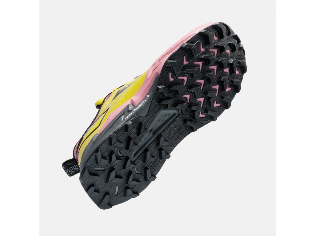 JOMA SIERRA LADY 2623  jsou trailové běžecké boty určené pro trénink i závody ve středně náročném až náročném terénu, kde oceníte stabilitu a jistý došlap. Odolný a zároveň prodyšný Jacquard svršek s TPU inserty chrání botu před oděrem a díky výztuze FLEXSHIELD lépe snáší nárazy o kameny či kořeny. O pevné usazení nohy se stará elastický jazyk a postranní zesílení, takže bota příjemně drží i při změnách směru a v sebězích. Mezipodešev s technologií FULL DUAL PULSOR SYSTEM kombinuje dvě hustoty phylonu, čímž vytváří vyvážené tlumení dopadů a současně potřebnou stabilitu pro těžší povrch. Pro ochranu chodidla je integrován systém BALANCE, který přidává na jistotě kroku, když terén začne být techničtější. Podrážka se systémem DURABILITY nabízí vysokou odolnost a výrazný grip „za každých podmínek“, přičemž drop 6 mm podporuje svižnější a přirozenější běžecký projev.