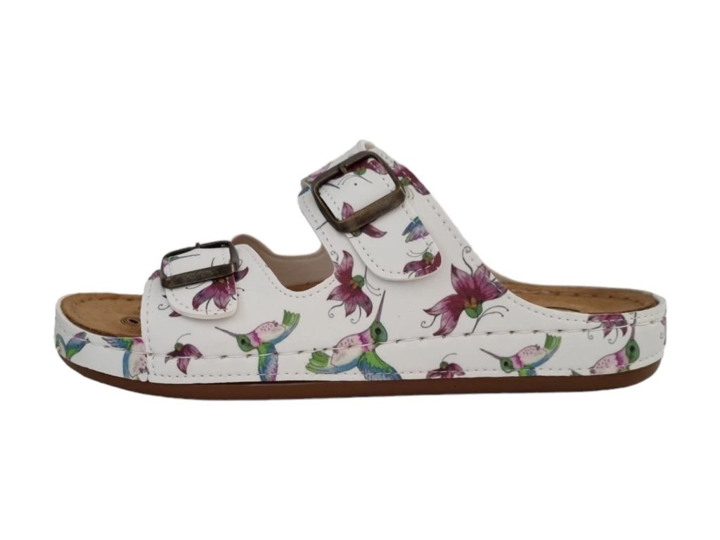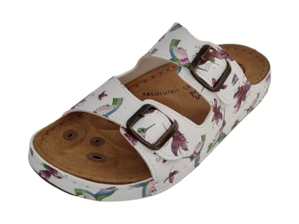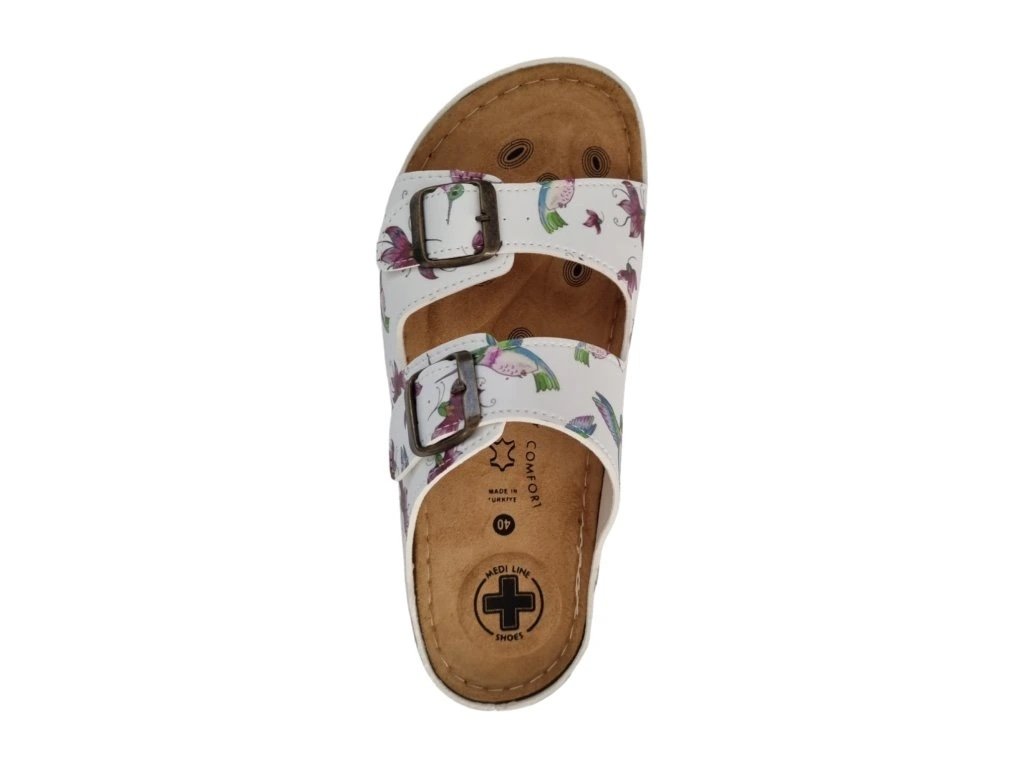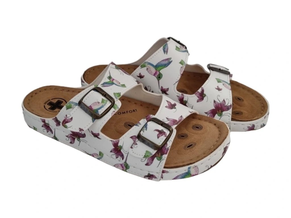 Dámské pantofle MEDI LINE S182.002 birds jsou ideální volbou pro ženy, které hledají spojení pohodlí, zdraví a designu. Jejich anatomicky tvarovaná masážní stélka přináší příjemnou úlevu při každém kroku, zatímco nastavitelný nárt pomocí suchých zipů zaručí, že padnou téměř na každou nohu. Díky šířce H jsou vhodné i pro širší chodidla. Svršek se zajímavým potiskem ptáčků dodává obuvi osobitý vzhled, a přitom je praktický na údržbu. Podrážka je lehká, ale přesto stabilní a bezpečná i při delším nošení. Vyjímatelná masážní stélka podporuje zdravý postoj a pomáhá předcházet bolestem chodidel. Pantofle MEDI LINE S182.002 birds se hodí jak do domácího prostředí, tak jako pracovní obuv pro zdravotníky, učitelky nebo prodavačky.