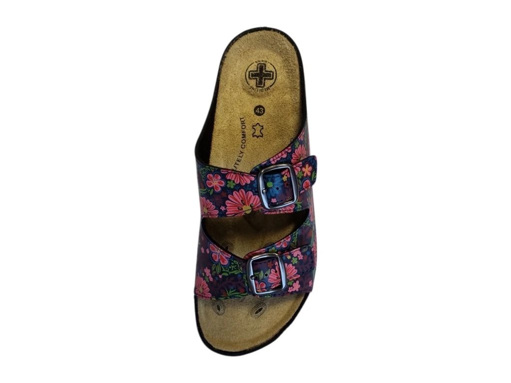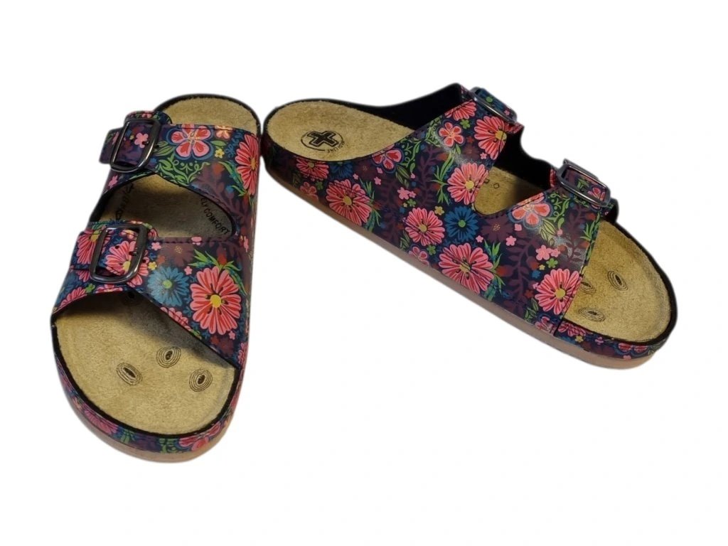 Mediline dámské pantofle S182 Jana černé květy jsou ideální volbou pro ženy, které hledají pohodlnou a zároveň praktickou domácí obuv. Díky otevřenému nártu a nastavitelnému pásku na suchý zip se snadno přizpůsobí tvaru chodidla a sednou i při vyšším nártu. Svršek ze syntetické kůže se snadno čistí a je velmi měkký na dotek. Vnitřní podšívka z textilu zajišťuje prodyšnost a komfort i při celodenním nošení. Lehká syntetická podrážka pomáhá tlumit nárazy při chůzi a zvyšuje celkový komfort. Největší předností je masážní anatomicky tvarovaná stélka stimulující reflexní body chodidla.