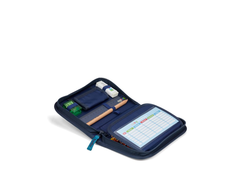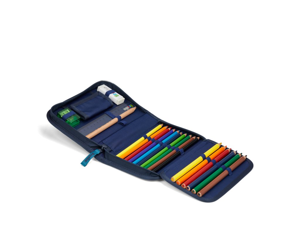 Jednopatrový penál Ergobag s chlopní a přihrádkou na rozvrh hodin, jehož součástí je dvaceti-dílný set, který obsahuje trojhranné pastelky a tužky produktové řady Lyra. Ergonomicky navržený trojhranný tvar tužek napomáhá správnému uchopení a držení.