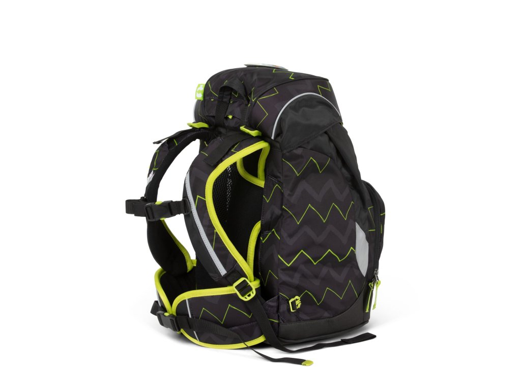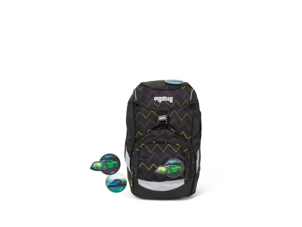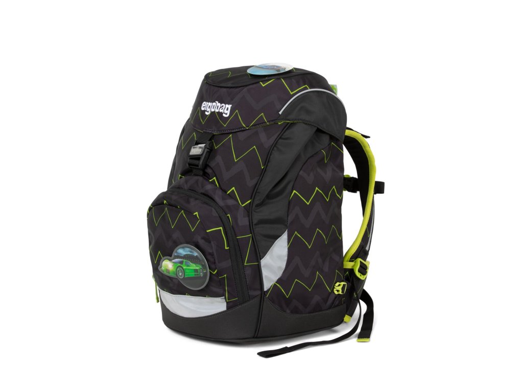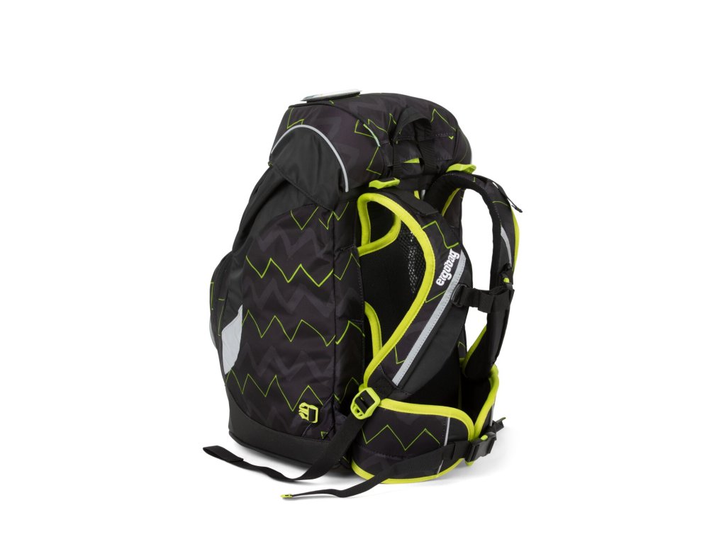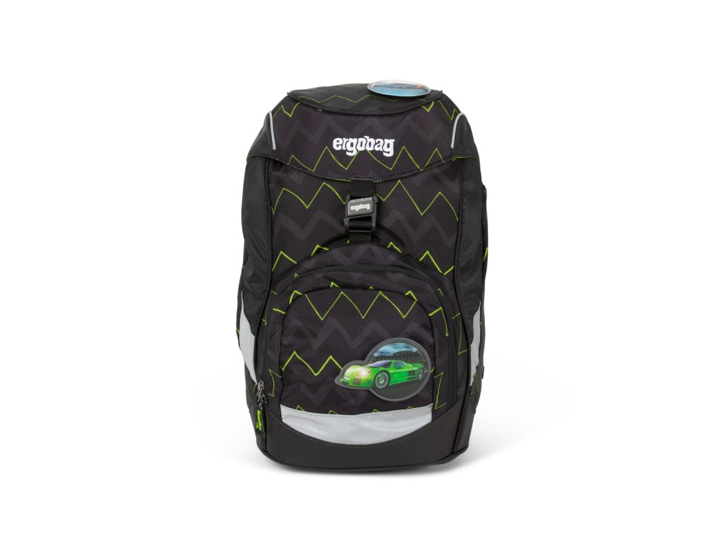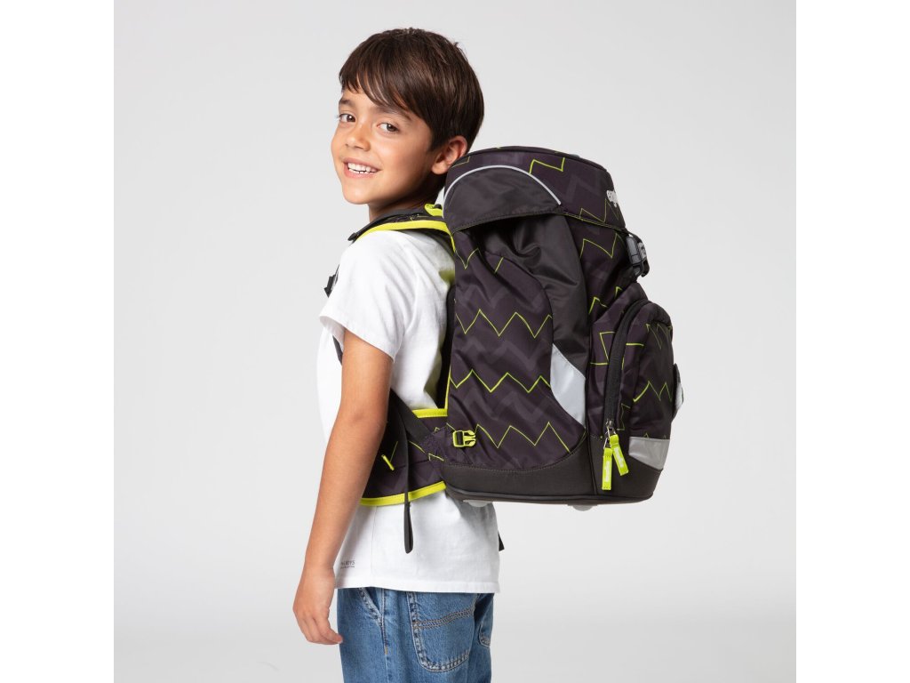 Školní batoh Ergobag prime- Černý Zig Zag – oproti modelové řadě 2019 jsou veškeré popruhy a přezky barevně sjednoceny s designem batohu a to i vč. předního zámku.Je určen pro 1. Stupeň základní školy, tj. od 1. do 4. třídy. Rostoucí zádový systém, lze přizpůsobit na výšku 100 -150 cm. Jedná se o ekologický produkt, který je 100% vyroben z recyklovaných PET lahví (cca 16 ks lahví 0,5l), plastové přezky neobsahují ftaláty a jiné škodlivé materiály. Jedná se o jednokomorový batoh s vnitřním členěním, který pojme až 20l objemu, je samostojný. Tento koncept umožňuje díky vnitřní kompresní šňůrce celkový náklad svázat, přitlačit na záda a eliminovat tak působící páku na záda. Prostor na láhev a svačinu je v přední kapse, nedochází tak k jednostrannému přetížení_ dysbalanci, jako když je láhev umístěna na straně batohu. Reflexní prvky zajišťují dobrou viditelnost za špatného počasí – dokonalá viditelnost z 360 stupňů. Látka je 2x impregnovaná, má vodní sloupec 1500mm a odolává tak dešti a nečistotám, lze dokoupit i pláštěnku (prostor v horním víku batohu). Obsahuje 2 Kletties – obrázky na suchý zip, které jsou výměnné.
